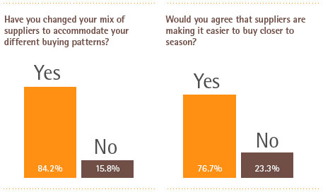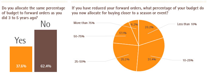 Retailers' Changing Approach to buying Retailers are reducing their forward ordering commitment and buying closer to seasons like Christmas and Spring occasions. Up to 24% of retailers in the survey are holding back more than 50% of their budget to buy closer to the season. This is being driven by tougher economic conditions and changing consumer behaviour. Retailers are looking for flexibility and speed which means suppliers are having to supply from closer to home. Buyers are also waiting to see what their customers are buying before repeating orders. According to the Seasonal Buying Report, the main reason to continue forward ordering is to guarantee supply of key products.