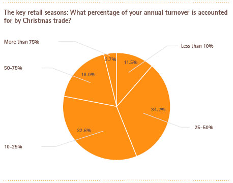 The importance of Christmas Christmas has become a make or break event for many retailers with a third of respondents saying that Christmas accounted for up to 50% of their annual turnover. For 18% surveyed, Christmas is worth up to an incredible 75% of total sales. November and December account for 21% of all retail sales in the UK across all sectors. The later ordering of stock by retailers appears to be driven by consumers themselves buying later and later which makes it harder to predict sales trends.